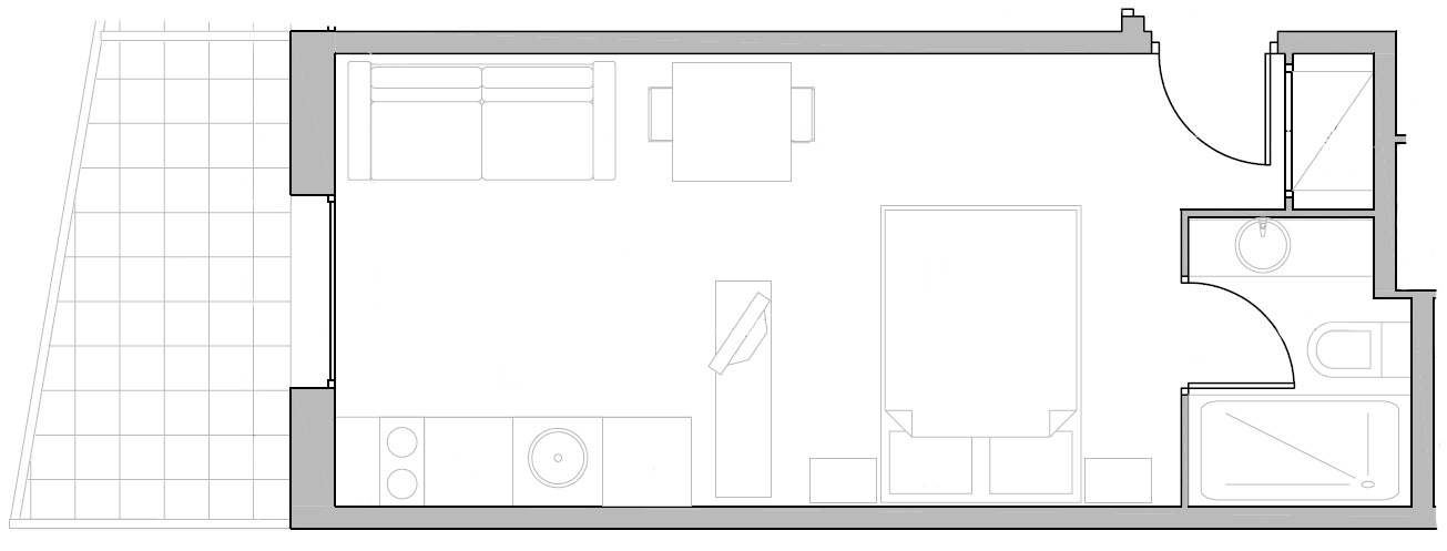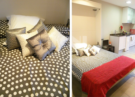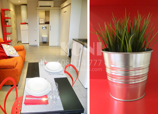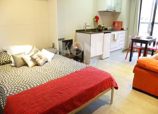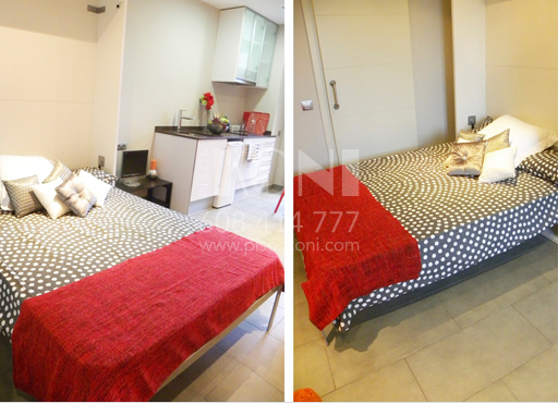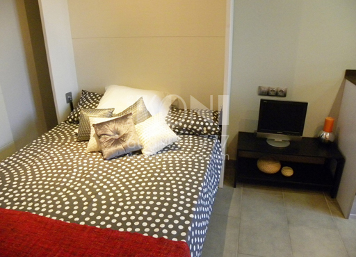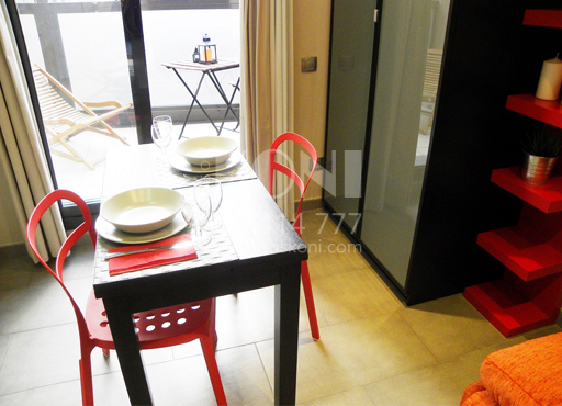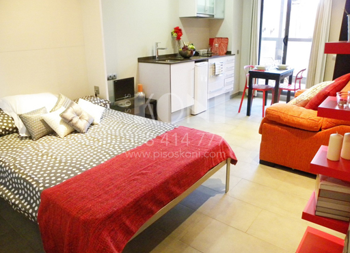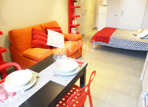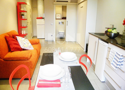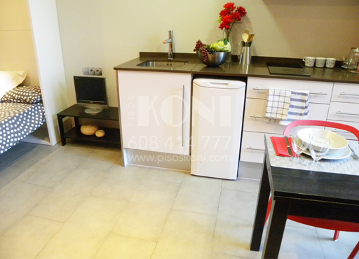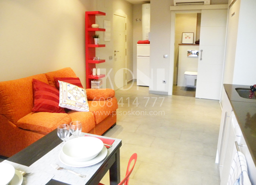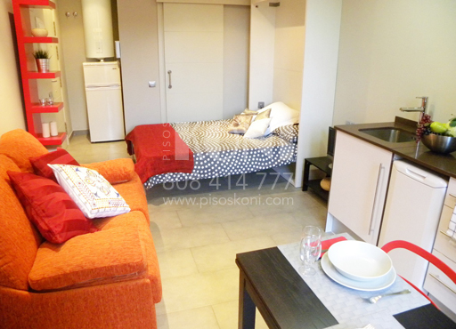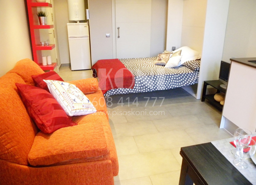 Mesa, 2 sillas, sofá, cama abatible, estanterías, armario…